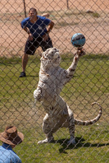 Today, Saturday we went to Out of Africa. This place is highly recommended for a nice family outing. The terrain is much more representative of Africa than other places we've seen. We took the Unimog tour which was a little more but the driver took us through the Serengetti area where he fed the lions, tigers, and bears, oh my! Also the hyenas which are really weird. We all had treats to feed the other animals. It was a very nice experience and we all had lots of fun. Then after that the real fun began: Tiger Splash! There is a fenced area with a pool where 6 of the workers and the owner are in there with a white tiger. The workers run around with a 10 foot pvc pole with an inflatable beach toy on the end while the tiger chases them! It is incredible to watch how fast the tiger is and how gentle it can be around the guys. Good thing tigers have retractable claws. Once the tiger catches the inflatable toy, it usually goes for the throat, the workers finish popping it so the tiger will lose interest and chase the next one.